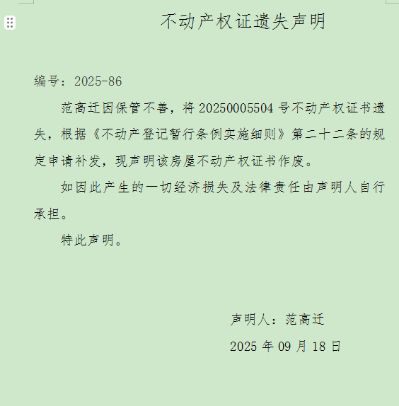 不動(dòng)產(chǎn)權(quán)證遺失聲明 編號(hào):2025-86