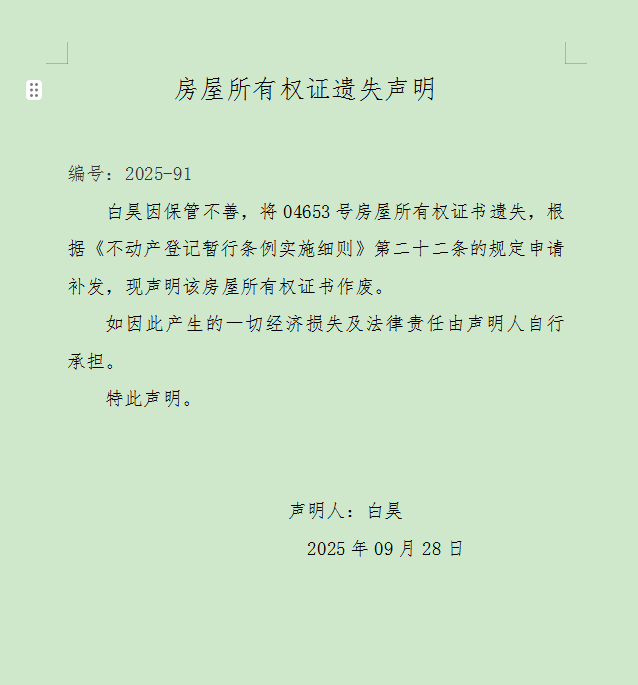 房屋所有權(quán)證遺失聲明 編號(hào):2025-91