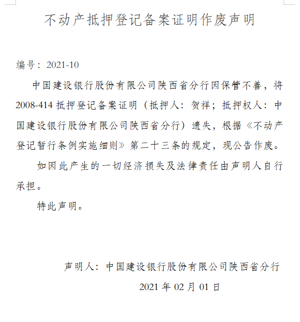 不動產抵押登記備案證明作廢聲明 編號:2021-10