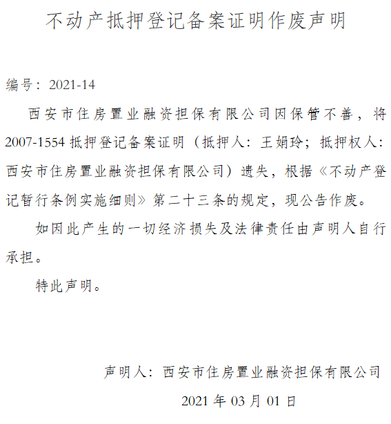不動產(chǎn)抵押登記備案證明作廢聲明 編號:2021-14