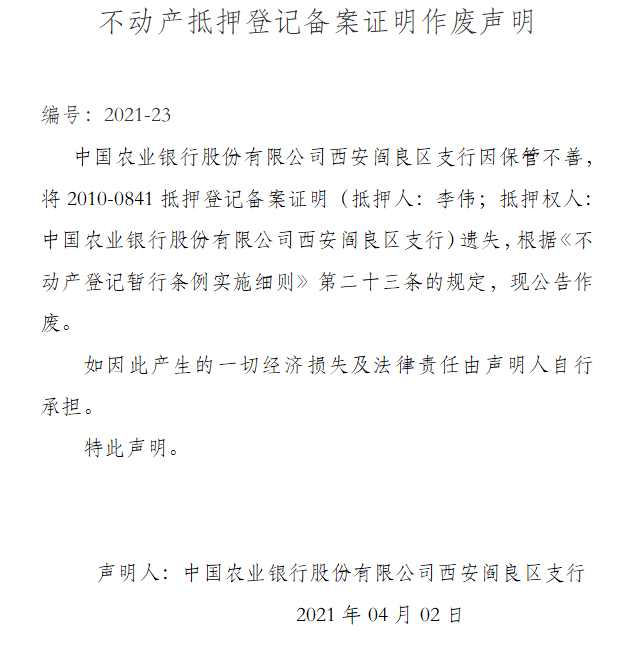 不動產抵押登記備案證明作廢 聲明編號:2021-23