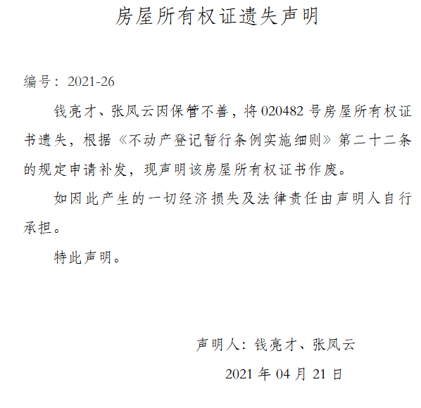房屋所有權(quán)證遺失聲明 編號(hào):2021-26