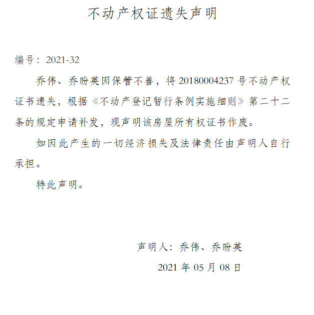 不動產權證遺失聲明 編號:2021-32