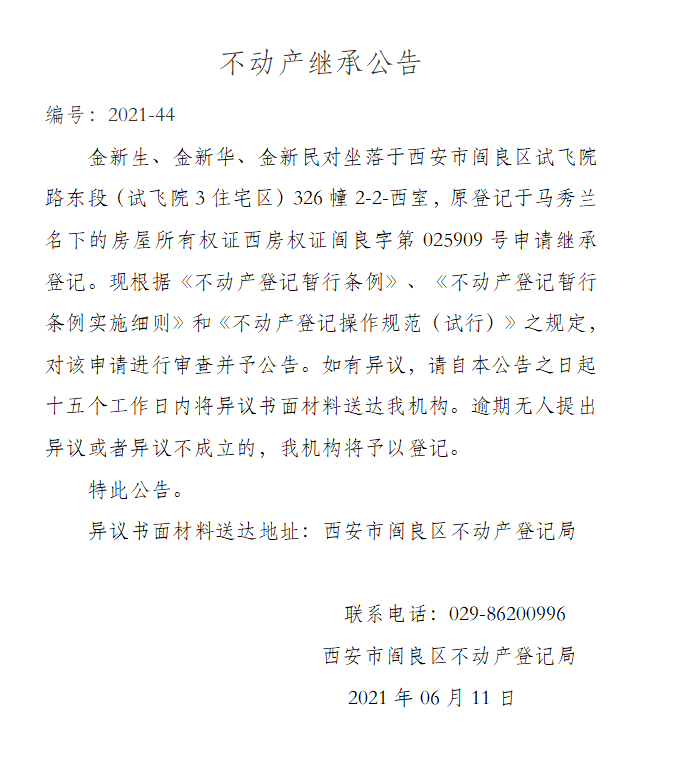 不動(dòng)產(chǎn)繼承公告 編號(hào):2021-44