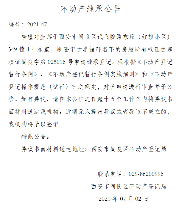 不動(dòng)產(chǎn)繼承公告 編號(hào):2021-47