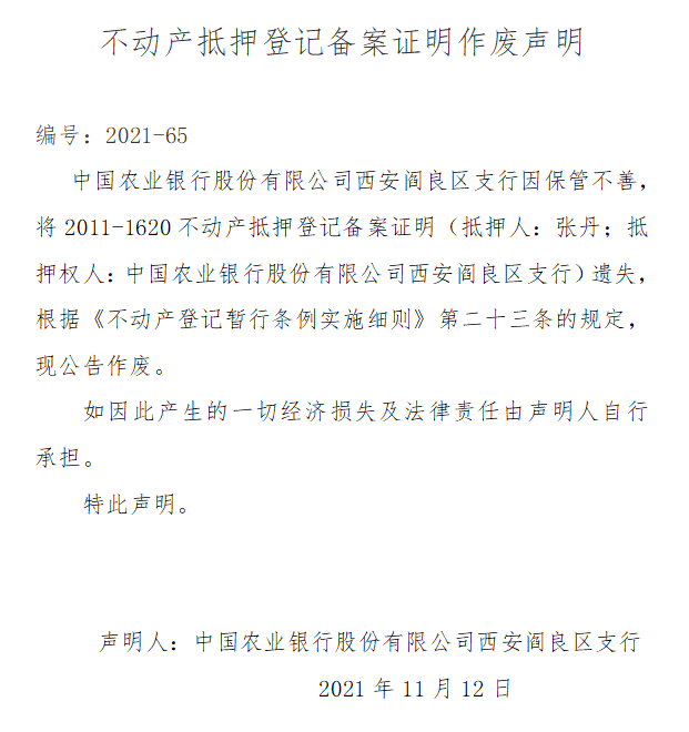 不動產抵押登記備案證明作廢聲明 編號:2021-65