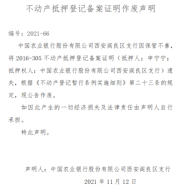 不動產抵押登記備案證明作廢聲明 編號:2021-66