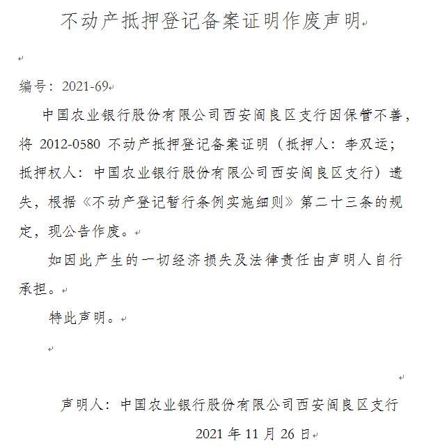 不動產抵押登記備案證明作廢聲明 編號:2021-69