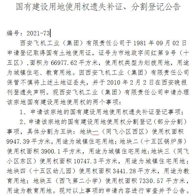 國有建設用地使用權遺失補證、分割登記公告 編號:2021-73