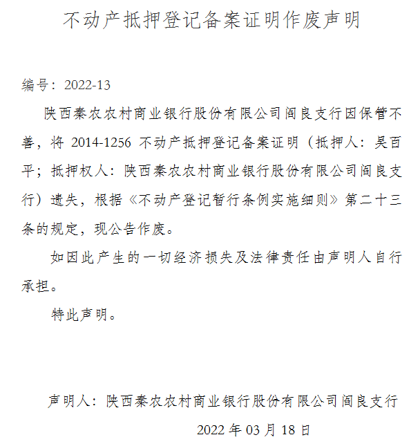 不動(dòng)產(chǎn)抵押登記備案證明作廢聲明 編號(hào):2022-13