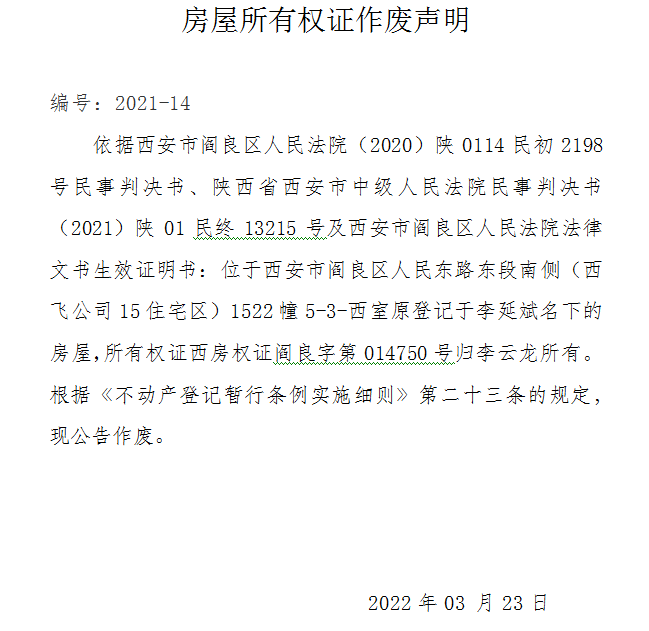 房屋所有權(quán)證作廢聲明 編號(hào):2021-14