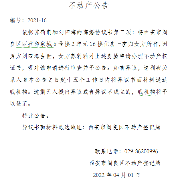 不動(dòng)產(chǎn)公告 編號(hào):2021-16