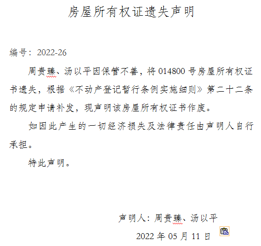 房屋所有權(quán)證遺失聲明 編號(hào):2022-26