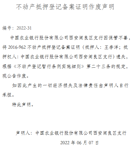 不動產抵押登記備案證明作廢聲明 編號:2022-31