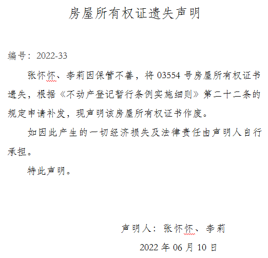 房屋所有權證遺失聲明 編號:2022-33