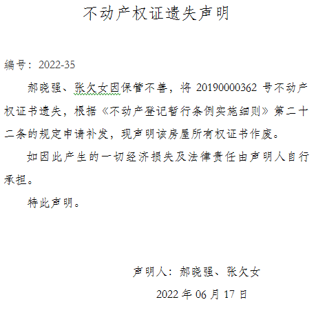 不動(dòng)產(chǎn)權(quán)證遺失聲明 編號(hào):2022-35