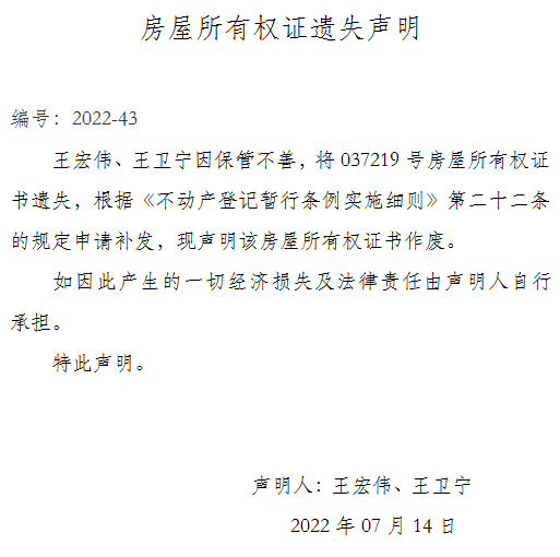 房屋所有權(quán)證遺失聲明 編號:2022-43