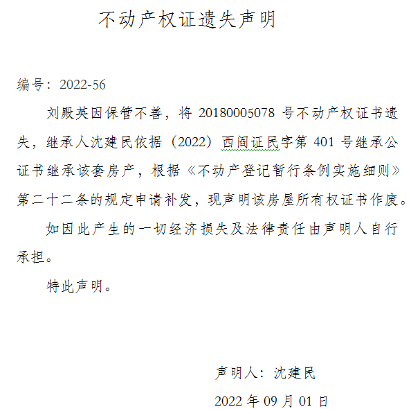 不動產(chǎn)權(quán)證遺失聲明 編號:2022-56