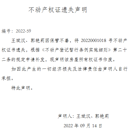 不動產權證遺失聲明 編號:2022-59