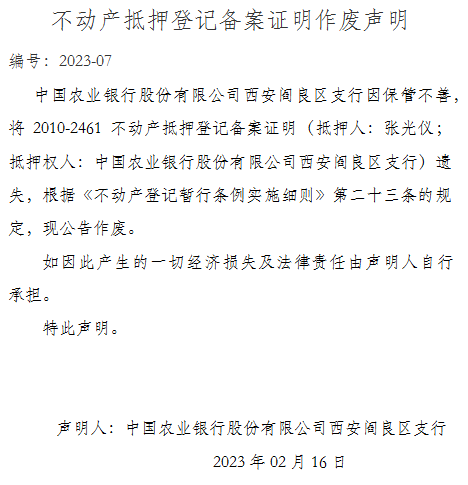 不動產抵押登記備案證明作廢聲明 編號:2023-07