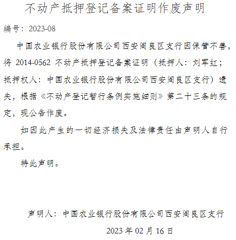 不動產抵押登記備案證明作廢聲明 編號:2023-08