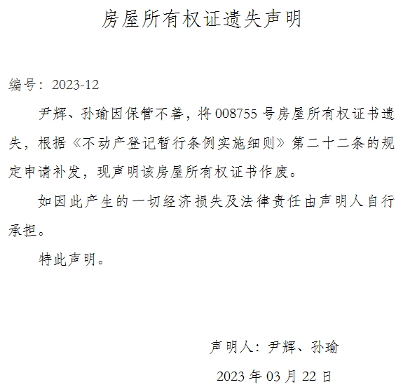 房屋所有權(quán)證遺失聲明 編號(hào):2023-12