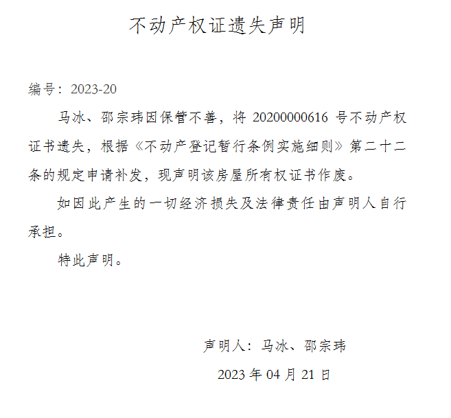 不動(dòng)產(chǎn)權(quán)證遺失聲明 編號(hào):2023-20