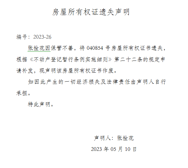 房屋所有權(quán)證遺失聲明 編號(hào):2023-26