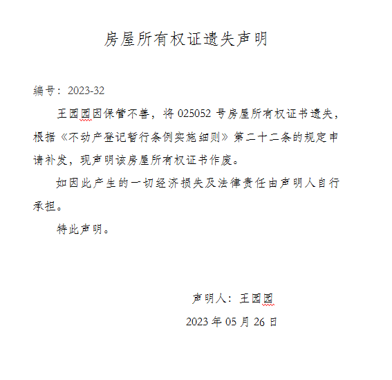 房屋所有權證遺失聲明 編號:2023-32