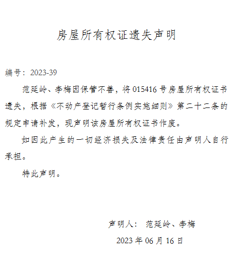 房屋所有權證遺失聲明 編號:2023-39