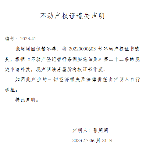 不動(dòng)產(chǎn)權(quán)證遺失聲明 編號(hào):2023-41