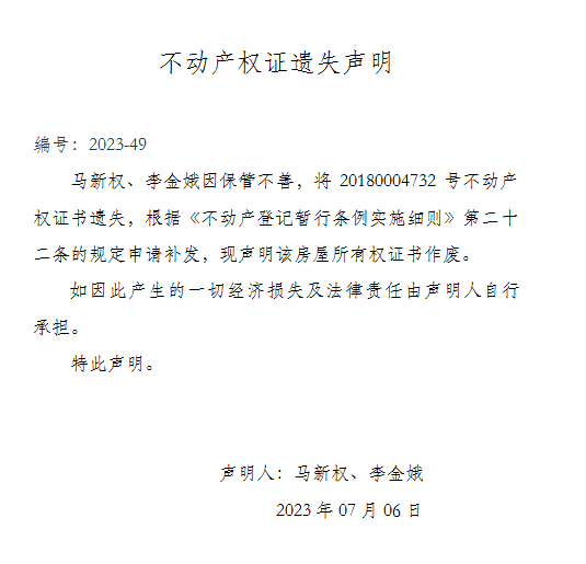 不動產(chǎn)權(quán)證遺失聲明 編號:2023-49