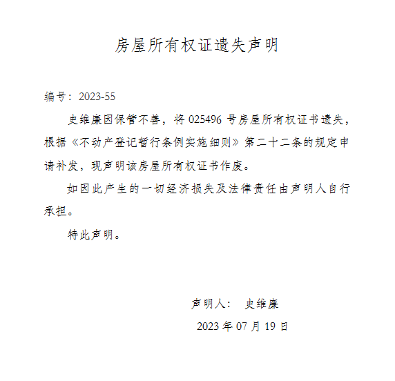 房屋所有權證遺失聲明 編號:2023-55