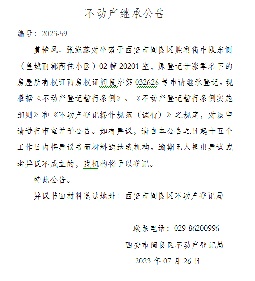 不動(dòng)產(chǎn)繼承公告 編號:2023-59