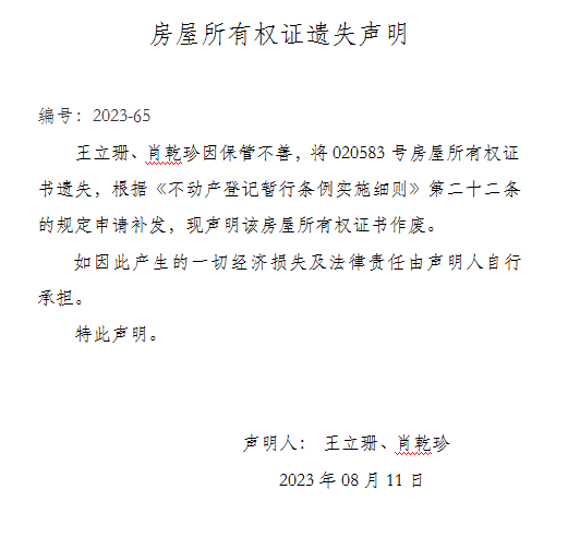 房屋所有權(quán)證遺失聲明 編號(hào):2023-65