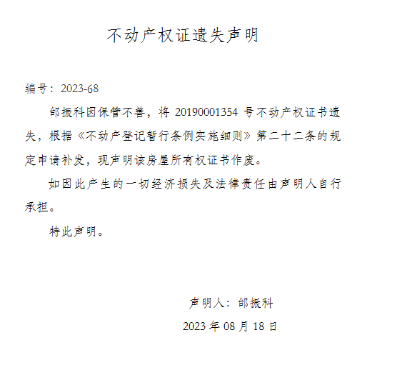 不動產權證遺失聲明 編號:2023-68