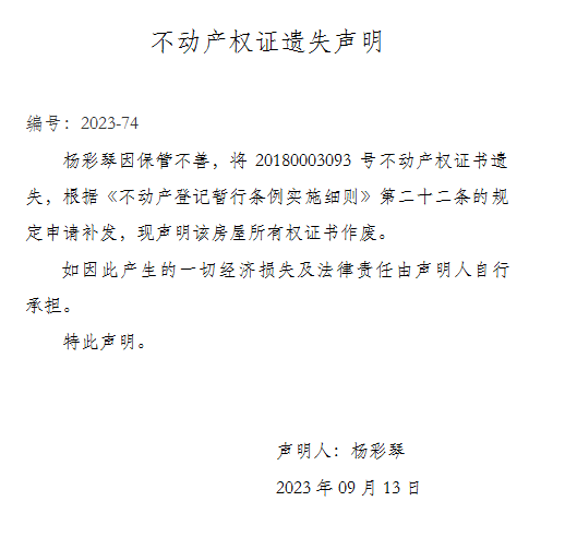不動(dòng)產(chǎn)權(quán)證遺失聲明 編號(hào):2023-74