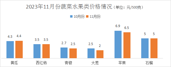 本月,蔬菜價格略有浮動,與上月相比:黃瓜價格為每500克4.4元,環比漲幅2.33%;西紅柿價格為每500克3.5元,環比持平;大蔥價格為每500克2元,環比降幅20%;青椒價格為每500克2.5元,環比降幅7.41%。水果類價格穩中有降,蘋果價格為每500克6.5元,環比降幅5.8%;獼猴桃價格為每500克8元,環比持平;石榴價格為每500克5元,環比持平。