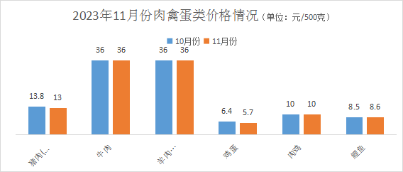 本月,豬肉(去骨后腿肉)價格每500克均價13元,環比降幅5.8%;牛肉(去骨后腿肉)價格每500克均價36元,環比持平;羊肉(去骨后腿肉)價格每500克均價36元,環比持平;新鮮完整雞蛋價格每500克均價5.7元,環比降幅10.94%;肉雞價格每500克均價10元,環比持平;鯉魚價格每500克8.6元,環比漲幅1.18%;牛奶、香煙、啤酒價格基本持平。