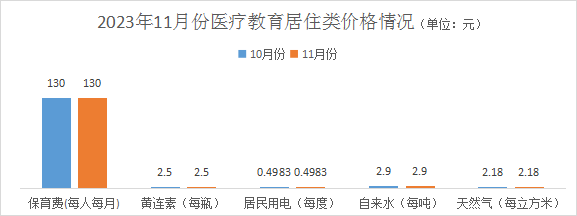 醫療、教育類價格環比基本持平,其中省級示范幼兒園保教費每人每月130元;瓶裝(50片)黃連素每瓶2.5元;居住類中居民用電、自來水、天然氣價格持平,居民照明用電每度0.4983元,民用自來水每噸2.9元。