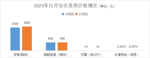 農資價格略有浮動。其中尿素均價2600元/噸,環比漲幅4%;碳酸氫氨均價900元/噸,環比持平;農膜均價14元/公斤(國產幅寬4米),環比持平;農灌用電價格每度0.2974元,與上月相比持平。