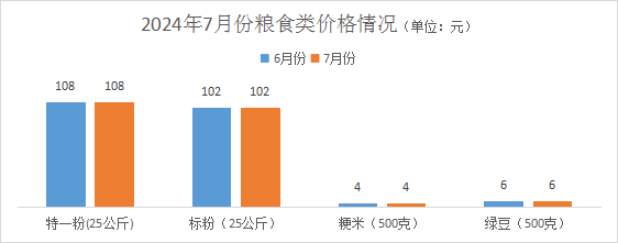 本月,當地品牌航城面粉特一粉價格108元/25公斤,環比持平;標準粉價格102元/25公斤,環比持平;粳米價格4.0元/500克,環比持平;綠豆價格6.0元/500克,環比持平。