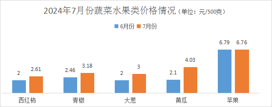 本月,蔬菜類價格以漲幅為主,與上月相比:西紅柿價格每500克均價2.61元,環比漲幅30.5%;青椒價格每500克均價3.18元,環比漲幅29.27%;大蔥價格每500克均價3元,環比漲幅50%;黃瓜價格每500克均價4.03元,環比漲幅92%。水果類價格略有浮動,以蘋果為例,蘋果價格每500克均價6.76元,環比降幅0.44%。