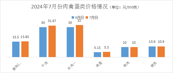 本月,豬肉(去骨后腿肉)價格每500克均價15.83元,環比漲幅2.13%;牛肉(去骨后腿肉)價格每500克均價31.67元,環比漲幅5.57%;羊肉(去骨后腿肉)價格每500克均價32元,環比漲幅6.67%;新鮮完整雞蛋價格每500克均價5.3元,環比漲幅3.31%;雞肉價格每500克均價10元,環比持平;鯉魚價格每500克均價10.9元,環比持平;牛奶、香煙、啤酒價格基本持平。