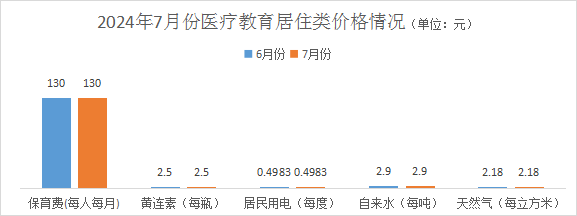 醫療、教育類價格環比持平,其中省級示范幼兒園保育費每人每月130元;瓶裝(50片)黃連素每瓶2.5元;居住類中居民用電、自來水、天然氣價格環比持平,居民照明用電每度0.4983元,民用自來水每噸2.9元。