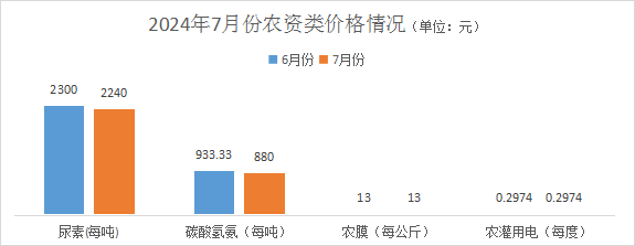 農資價格略有浮動。其中尿素均價2240元/噸,環比降幅2.6%;碳酸氫氨均價880元/噸,環比降幅5.71%;農膜均價13元/公斤(國產幅寬4米),環比持平;農灌用電價格每度0.2974元,環比持平。