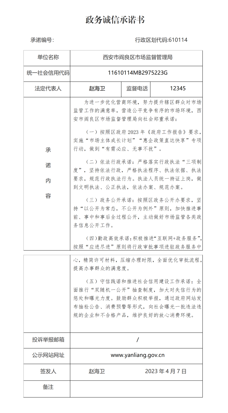 閻良區(qū)市場監(jiān)管局政務(wù)誠信承諾書