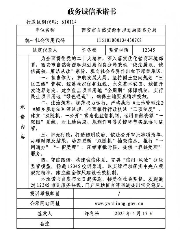 西安市自然資源和規(guī)劃局閻良分局政務(wù)誠(chéng)信承諾書