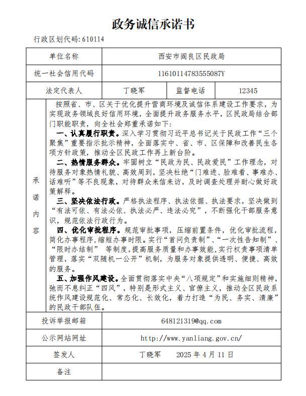 閻良區(qū)民政局政務(wù)誠(chéng)信承諾書
