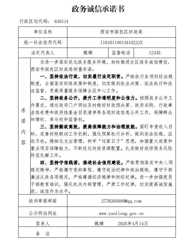 閻良區財政局政務誠信承諾書